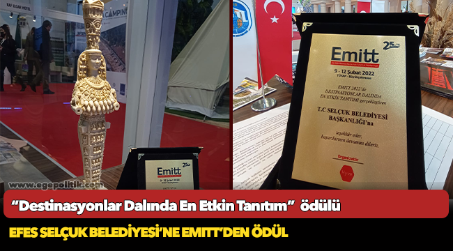 Efes Selçuk Belediyesi EMITT 2022’de ödül aldı. Bu yıl 25. Kez kapılarını açan fuara “Efes Bizimdir” sloganıyla katılan, Efes Selçuk’un sesini duyuran Efes Selçuk Belediyesi en etkin tanıtım ödülünü almaya hak kazandı. Ayrıca Efes Selçuk Belediyesi adına Muğla Ağaçlandırma Sahalarına da fidan dikildi.