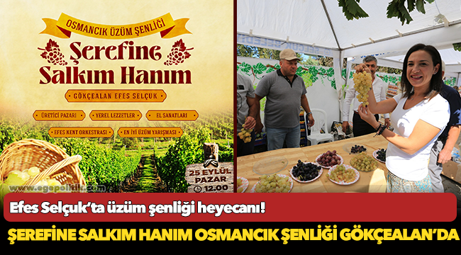 Şerefine Salkım Hanım Osmancık Üzüm Şenliği kapsamında 25 Eylül Pazar günü saat 12.00’de yerel üretici stantları açılacak. Gökçealan’a özgü Osmancık Üzümüne atfedilen şenlik saat 14.00’te Osmancık Üzümü hasadı ile başlayacak. Açılış konuşmaları, çeşitli gösteriler ve performansların da yer alacağı şenlik kapsamında “En Güzel Osmancık Üzüm Yarışması” düzenlenecek. Efes Selçuk’un yerel seslerinden oluşan Efes Kent Orkestrası ve Akustik Gitarlı Kız İrem de şenlik de müzik performanslarıyla yer alacak.