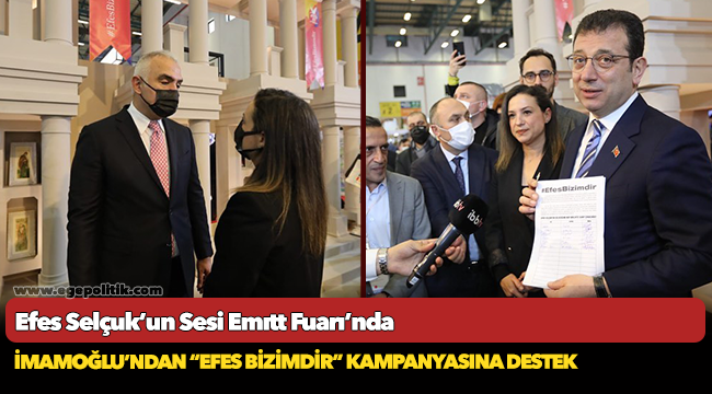EMITT Fuarı’nda yer alan Efes Selçuk standını ilk gün ziyaret edenler arasında Kültür ve Turizm Bakanı Mehmet Nuri Ersoy ve İstanbul Büyükşehir Belediye Başkanı Ekrem İmamoğlu da yer aldı. #EfesBizimdir kampanyasına destek olduklarını belirten İmamoğlu; “Efes Selçuk’un hakkını, hukukunu koruyan bir belediye başkanımız olduğunu, özellikle de bir kadın hassasiyeti ile bunu yaptığını İstanbul’dan keyif ile takip ediyorum. Mücadelesinde Başkanımızın yanındayım” dedi.