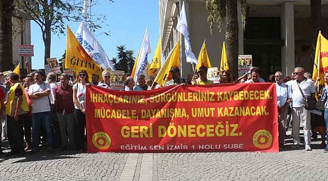 Konak Eski Sümerbank önündeki açıklamada 'İhraçlarınız, Sürgünleriniz Kaybedecek. Mücadele, Dayanışma, Umut Kazanacak. Geri Döneceğiz' pankartı açılırken açıklamaya emek ve demokrasi güçlerinin temsilcileri de katıldı.