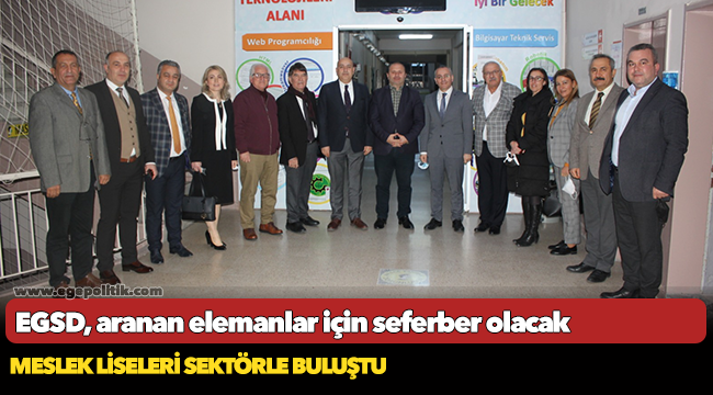 Gaziemir Şehit Serhat Sığnak Mesleki ve Teknik Anadolu Lisesi’nde yapılan etkinlikte mesleki eğitimin önemi ve meslek liselerine iş yaşamında duyulan ihtiyaç vurgulanırken, toplantıya İzmir İl Milli Eğitim Müdür Yardımcısı Medet Ekşi, Gaziemir İlçe Milli Eğitim Müdürü Ali Musa Bina, EGSD Yönetim Kurulu üyeleri Büşra Genevlioğlu ve Şaban Öngören, iş dünyası temsilcileri meslek lisesi yöneticileri ve öğretmenler katıldı.