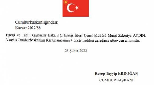 Cumhurbaşkanlığı tarafından yapılan atama kararları Resmi Gazete’nin bugünkü sayısında yer aldı. Buna göre, Enerji ve Tabii Kaynaklar Bakanlığı Enerji İşleri Genel Müdürü Murat Zekeriya Aydın görevden alındı.