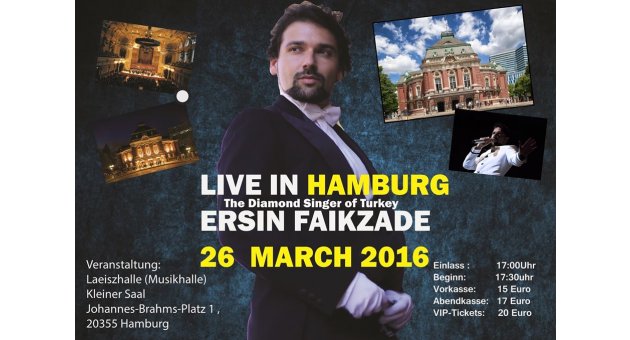 Türkiye'nin Uluslararası sevgi,hoşgörü ve BARIŞ elçisi, Elmas Çocuk lakaplı ,ülkemizin en güclü seslerinden Ersin Faikzade 26 Mart 2016 Akşamı Almanya'daki sevenleri ile buluşacak .