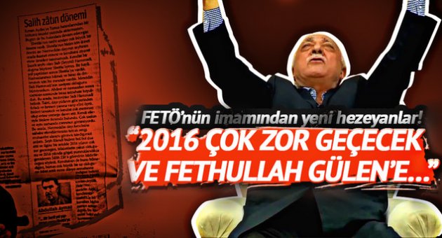 Fetullah Gülen'in en önemli isimlerinden, Zaman Gazetesi'nin de imamlığı görevini yapan Abdullah Aymaz bugünkü yazısında şaşırtan hezeyanlara yer verdi. Gülen örgütünün dağılmasını engellemek için mistik hezeyanlar uydurmaktan çekinmeyen Fetullah Gülen medyası bu kez Abdullah Aymaz aracılığıyla örgüt sempatizanlarına gizli mesaj verdi. Örgüt üyelerini motive etmek için FETÖ'ye yakın tüm haber sitelerinde manşet olan bu köşe yazısına göre "2016 da zor geçecek, felaketler gelecek, ardında görev "göğsü yumruklandıkça genişleyen Salih Zat'a" yani Fetullah Gülen'e verilecek. Fetullah Gülen'e yakın isimlere göre Abdullah Aymaz hezeyanlarla dolu yazısında "yumruk yedikçe güçlenen Salih Zat'a 2016'da görev verilecek" diyerek FETÖ'nün Mesih'i yani Fetullah Gülen'i işaret ediyor.