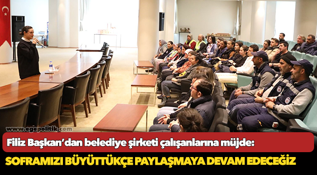 “Hep sofrayı büyütmek ile ilgili bir kaygımız var. O sofrayı büyütürken de doğru düzgün büyütmek istiyoruz. Nasıl ben kendi kızım Nefes’i düşünüyorsam, emin olun ki hiçbirinizi de ayrı tutmuyorum. Hepimizin huzurlu bir şekilde çalışması için de mücadele ediyorum. Hiç talebiniz olmamış olmasına rağmen, herhangi bir şekilde belki aklınızda hiç düşünce olmamasına rağmen sizin lehinize çalışmaya devam ettiğimiz bir dönemden geçiyoruz. Belediye ve belediyenin kadroları ile ilgili düşünürken aynı zamanda Efes Proje Yönetim Şirketi’ni ve sizleri de es geçmeden çalışıyoruz. Bir yandan depremlerle uğraşırken, bir yanda da burası ile ilgili ne yapabiliriz diye düşündüğümüzde, biz hiç kimseye haber etmeden bir şey yaptık. O da şu; gittik bankalarla konuştuk. Ve bankalara dedik ki; bizim çalışma arkadaşlarımızın maaşlarını sizlere geçirebiliriz. Ne yaparsınız? Ve bunu gerçekleştirdik. O anlamda tam bu dar zamanlarda bu dayanışmamızın bir örneği olsun dedik. Yakın bir zamanda her birinize 9750 TL ekstradan para gelecek. Güle güle harcayın hepiniz.”