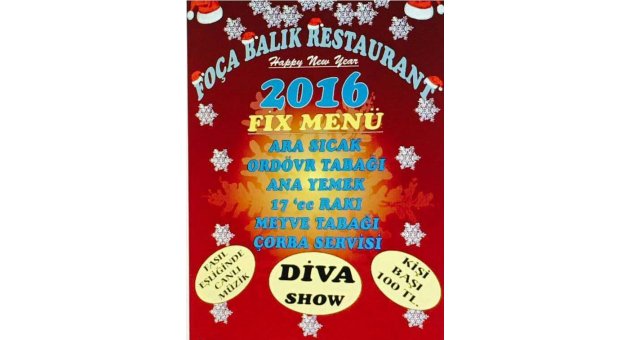 İzmir'in en çok tercih edilen eğlence mekanlarından Foça Balık Restaurant, 2016'ya muhteşem bir organizayon ile merhaba diyor. Ara sıcak, ordövr tabağı, ana yemek, 17 cc rakı, meyve tabağı ve çorba servisinin bulunduğu Fix Menü, fasıl eşliğinde canlı müzik ve Diva Emrah Show kişi başı yalnızca 100 TL.