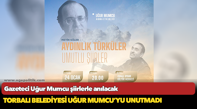 Torbalı Belediyesi, ilçede kültürel ve sanatsal etkinliklere devam ediyor. Bu kapsamda birbirinden önemli etkinlikler düzenleyen Torbalı Belediyesi 24 Ocak Salı günü çok anlamlı bir organizasyon daha gerçekleştirecek. 24 Ocak 1993 yılında evinin önünde arabasına yerleştirilen bombanın patlaması sonucu hayatını kaybeden Cumhuriyetimizin yetiştirdiği büyük gazeteci Uğur Mumcu ölümünün yıl dönümünde Torbalı’da şiirlerle anılacak. Tiyatro sanatçısı Metin Güler tarafından şiirlerin okunacağı “Aydınlık Türküler Umutlu Şiirler” adlı etkinlik 24 Ocak Salı günü saat 20.00'de İsmail Uygur Kültür Merkezi’nde gerçekleşecek.