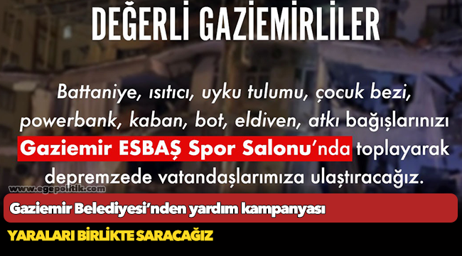 Sosyal medya hesabı üzerinden kampanyayı duyuran Gaziemir Belediye Başkanı Halil Arda, “Değerli Gaziemirliler, acımız büyük. Battaniye, ısıtıcı, uyku tulumu, çocuk bezi, powerbank, kaban, bot, eldiven, atkı bağışlarınızı Gaziemir ESBAŞ Spor Salonu’nda toplayarak depremzede vatandaşlarımıza ulaştıracağız. Yaraları birlikte saracağız” dedi.