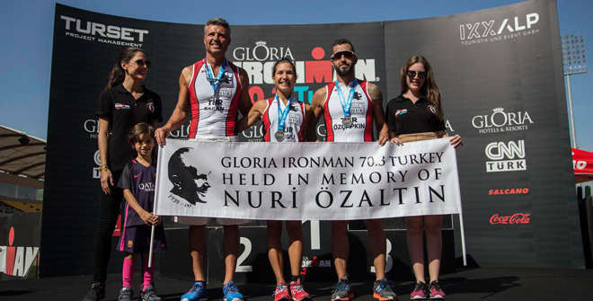 Bu seneki Gloria Ironman 70.3 Turkey yarışı, Temmuz ayında aramızdan ayrılan Özaltın Holding’in Kurucu Başkanı merhum Nuri Özaltın’ın anısına yapıldı. Yarışta Nuri Özaltın anısına takım olarak yarışan Saadettin Saran, Kerem Özçapkın ve ülkemizi Hawaii de Ironman Dünya Şampiyonasında temsil eden tek Türk kadın triatlet Bahar Saygılı 04:34:06 zamanlamayla kendi kategorilerinde birinci olurken, Spor Müdürü Cem Yılmaz’ın kaptanlığını üstlendiği CNNTürk ekibi de yarışmayı başarıyla tamamladı.