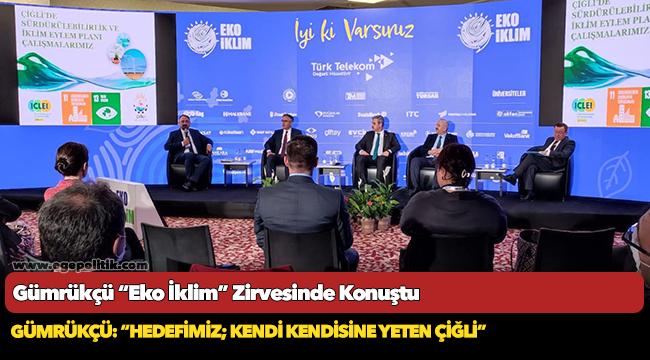 Eko İklim Zirvesinde konuşma yapan Çiğli Belediye Başkanı Utku Gümrükçü, “Çiğli, 210 bin nüfusuyla İzmir’in merkezinde ve gelişmekte olan bir ilçe. Katı Atık Bertaraf Tesisi, İZSU Arıtma Tesisi ve 600 fabrikanın yer aldığı bir organize sanayi bölgesini sınırları içerisinde bulunduruyor. 2019 yılında göreve geldiğimizde Çiğli’yi kendi kendisine yeten dirençli bir kent haline getirmek adına planlamalarımızı yaptık ve çalışmalarımızı bu doğrultuda adım adım sürdürüyoruz. 2019 yılında 20 belediye ile beraber Sürdürülebilir Kentsel Gelişim Ağının kurucusu olduk. Çiğli Belediyesi’nde ve tüm belediyelerimizde Sürdürülebilirlik Ofislerimizi kurduk. Akabinde Enerji Yönetim Birimizi kurarak hem tasarruf hem de sürdürülebilir enerji üretme noktasında yapacağımız çalışmaları şekillendirdik. Görevi devraldığımızda yalnızca bir tane olan güneş santrallerimizi 4’e çıkarmak için gerekli anlaşmaları yaptık” dedi.