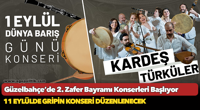 30 Ağustos Zafer Bayramı Kutlamaları Güzelbahçe Genco Erkal Açık Hava Tiyatrosu’nda yapılacak. 1 Eylül’de Kardeş Türküler, 11 Eylülde Gripin konseri düzenlenecek.