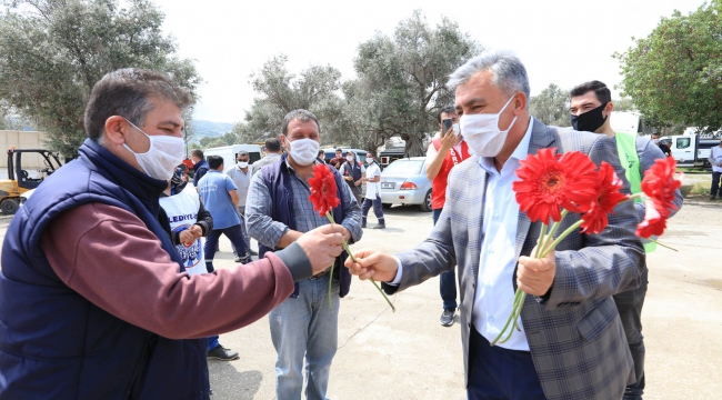 Konuşmaların ardından Başkanlar işçilerin bayramını kutlayarak çiçek dağıttı, hep birlikte 1 Mayıs Marşı söylendi.