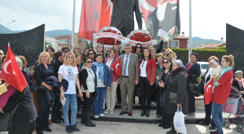 Öncülüğünü Kent Konseyi Kadın Meclisi’nin yaptığı ve CHP Parti Meclis Üyesi Sevda Erdan Kılınç, Güzelbahçe Belediye Başkanı Mustafa İnce, CHP İlçe Başkanı Kazım Çam, CHP Kadın Kolları Başkanı Menekşe Işın, belediye meclis üyeleri ve çeşitli kadın derneklerinin temsilci ve üyelerinin katıldığı yürüyüş Güzelbahçe Vapur İskelesi’nde başladı. Sahil boyunca ellerinde taşıdıkları dövizlerle yürüyerek, sloganlar atarak Tabaoğlu Parkı’ndaki Atatürk Anıtı’nın önüne gelen kadınlar burada saygı duruşunda bulundu, İstiklal Marşı söyledi, ardından çelenk koydu.