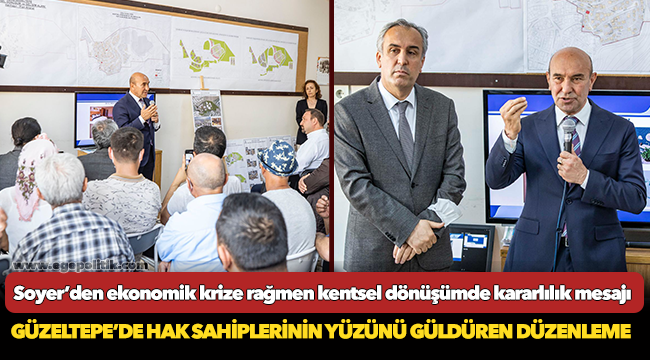 İzmir Büyükşehir Belediye Başkanı Tunç Soyer, Çiğli Güzeltepe Kentsel Dönüşüm Projesi kapsamındaki hak sahipleriyle buluştu. Hak sahiplerinin talebi üzerine yapılan düzenlemeyle İzmir Büyükşehir Belediyesi, Türkiye’de ilk defa 30 dönümlük arazisini projeye bedelsiz dahil etti. Başkan Tunç Soyer ise ekonomik krize rağmen kentsel dönüşümde kararlılık mesajı verdi.