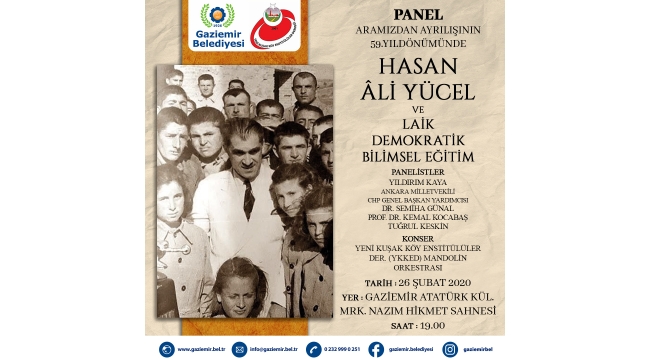 Gaziemir Belediyesi ile Yeni Kuşak Köy Enstitülüler Derneği’nin birlikte düzenleyeceği etkinlikte; Köy Enstitülerinin kurucusu ve Milli Eğitim eski Bakanı Hasan Âli Yücel, ölümünün 59. yılında Türkiye’nin önemli isimlerinin katılacağı panel ile anılacak. Eğitim ve kültür alanında yaptığı reformlarla ülkemizin tarihine ismini altın harflerle yazdıran Yücel anısına düzenlenecek “Hasan Âli Yücel ve Laik, Demokratik ve Bilimsel Eğitim Paneli”nde; siyaset, akademi ve edebiyat dünyasından önemli isimler Gaziemirlilerle bir araya gelecek.