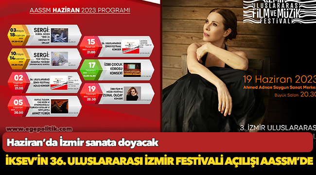 İzmir Büyükşehir Belediyesi ev sahipliğinde İKSEV tarafından 2 Haziran-11 Temmuz tarihleri arasında 36. Uluslararası İzmir Festivali Ahmed Adnan Saygun Sanat Merkezi’nde olacak. Açılış şef Oğuzhan Balcı yönetiminde Özgecan Günöz ve Can Özhan'ın solistliğindeki İZDSO konseri ile başlayacak. Konser, 2 Haziran Cuma günü AASSM Büyük Salon’da olacak.