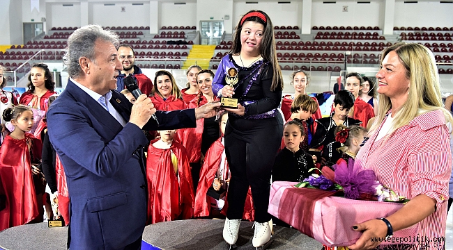İduğ, “özel sporcular” kategorisinde Türkiye genelinde birçok dalda başarı elde eden ve madalyaları bulunan Down Sendromlu Bornovalı minik Selin’e buz patenindeki başarıları için bir sürpriz yaparak yeni paten hediye etti.