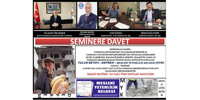 İzmir Emlak Kulübü, Karşıyaka Müteahhitler ve İş Adamları Derneği ve Karşıyaka Yapı Müteahhitleri Derneği'nin ortaklaşa düzenlediği Çevre ve Şehircilik Bakanlığı İzmir İl Müdürü Selahattin Varan ve Karşıyaka Belediye Başkanı Hüseyin Mutlu Akpınar'ın katılacağı tulum beton - deprem - mesleki yeterlilik belgesi (MYK) konulu seminer 21 Ekim 2016 Cuma günü saat 15:30'da Karşıyaka Belediye Binası Toplantı Salonu'nda gerçekleşecek.