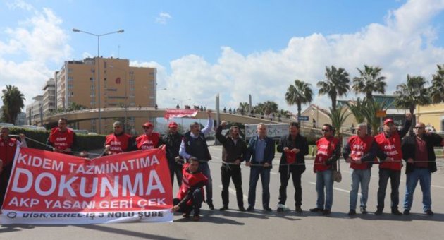 Cumhuriyet Bulvarı'nın Konak Pier Köprüsü altında kendilerini yolu kapattıkları zincirlere bağlayan Genel İş İzmir 3 Nolu Şube üyesi işçiler 'Hükümet İstifa', 'Hükümet Yasanı Al Başına Çal' ve 'Kıdeme Uzanan Eller Kırılsın' sloganları attı.