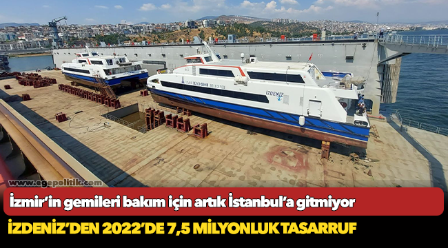 Deniz ulaşımında hizmet kalitesini ve sefer sıklığını artıran İZDENİZ A.Ş. önceki yıllarda bakım ve onarım için İstanbul’a göndermek zorunda kaldığı gemilerini artık İzmir’de onarıyor. Böylelikle İZDENİZ A.Ş. 2022’de 7,5 milyon TL tasarruf sağladı.