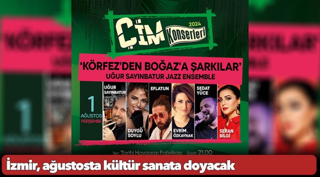 İzmirliler ağustos ayında konser, sergi, sinema ve tiyatro gibi pek çok etkinlikle buluşacak. İzmir Büyükşehir Belediyesi Kültür ve Sanat Dairesi Başkanlığı tarafından düzenlenen veya desteklenen etkinlikler, kenti kültür sanata doyuracak.