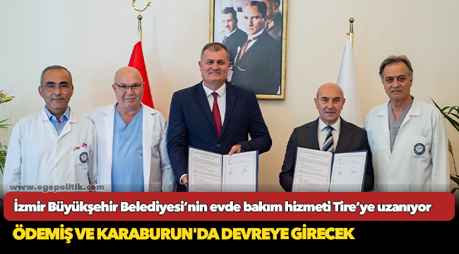 Evde bakım hizmetini 30 ilçeye yayan İzmir Büyükşehir Belediyesi Eşrefpaşa Hastanesi, Kemalpaşa ve Bayraklı’nın ardından Tire'de de Evde Bakım Hizmet Birimi açacak. İzmir Büyükşehir Belediye Başkanı Tunç Soyer ile Tire Belediye Başkanı Salih Atakan Duran ilçede kurulacak hizmet birimi için protokol imzaladı. Başkan Soyer önümüzdeki günlerde Ödemiş ve Karaburun'da da evde bakım hizmet biriminin devreye gireceğini duyurdu.