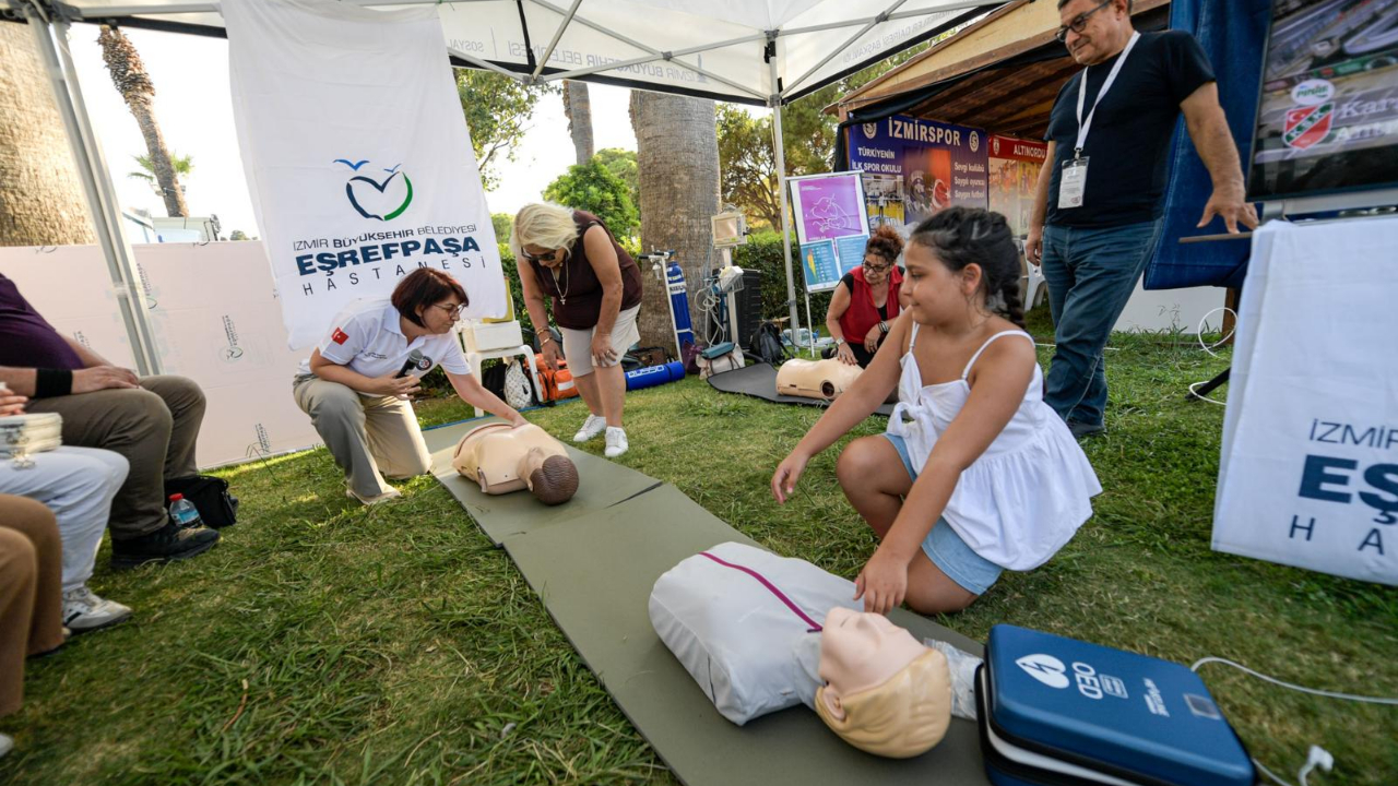 94. İzmir Enternasyonal Fuarı’nda yerini alan Türkiye’nin ilk ve tek belediye hastanesi İzmir Büyükşehir Belediyesi Eşrefpaşa Hastanesi, fuar ziyaretçilerine ilkyardım eğitimleri verdi. Hastane dışında gerçekleşen ani kalp durması vakalarında hayati önem taşıyan kalp masajı uygulaması, 90 saniye gibi kısa bir sürede stant ziyaretçilerine uzman hekimler ve hemşireler tarafından uygulamalı olarak anlatıldı. Aynı zamanda Acil Tıp Uzmanı olan Eşrefpaşa Hastanesi Başhekimi Doç. Dr. Başak Bayram, İzmir Büyükşehir Belediyesi tarafından şehrin farklı noktalarına yerleştirilmesi planlanan otomatik elektroşok cihazını da tanıttı. İlk müdahale sırasında başarı oranını artıracak cihaz, ani kalp durma vakalarında vatandaşlar tarafından sesli komut desteği sayesinde rahatlıkla kullanılabilecek.