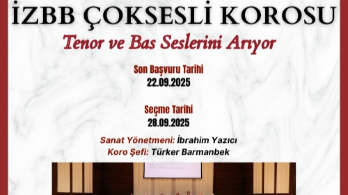 İzmir Büyükşehir Belediyesi Çoksesli Korosu’na ise 18 yaş ve üzerindeki erkek adaylar başvurabiliyor. Çalışmalar, 30 Eylül tarihi itibariyle salı günleri 19.30-21.30 saatleri arasında Ahmed Adnan Saygun Sanat Merkezi’nde gerçekleştirilecek.
