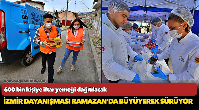 İzmir Büyükşehir Belediyesi ekipleri ihtiyaç sahibi yurttaşlara iftar saatlerinde kapı kapı dolaşarak sıcak yemek dağıtımına başladı. Biz İzmir Dayanışma Noktaları, parklar, üniversite çevreleri ve metro istasyonlarında da iftar yemeği hizmeti devreye alındı. İzmirliler de Halkın Bakkalı üzerinden iftar paketi satın alarak dayanışmaya katılabiliyor. Satın alınan paketler İzmir Büyükşehir Belediyesi tarafından ihtiyaç sahiplerine ulaştırılıyor. Büyükşehir Belediyesi, Ramazan ayında toplam 600 bin kişilik iftar yemeği dağıtmayı hedefliyor.
