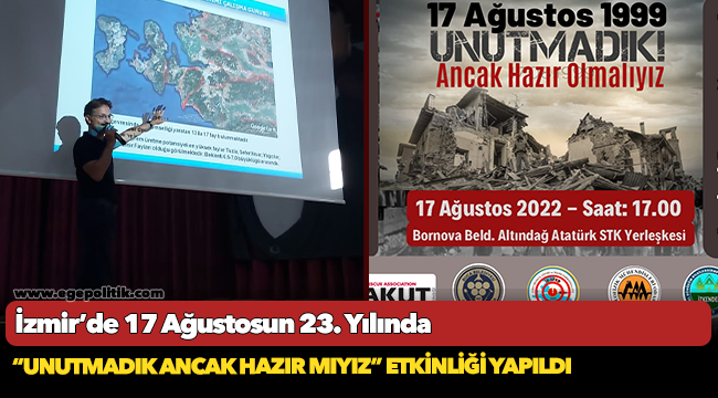 AKUT(Arama Kurtarma Derneği), İZKENDER (İzmir Kentsel Dönüşüm Derneği) , JFMO (Jeofizik Mühendisleri Odası İzmir Şubesi), BUCAKUT (Buca Belediyesi Arama Kurtarma Ekibi) ve İzmir Kent Konseyi Bütünleşik Afet Yönetimi Çalışma Grubu gibi paydaş ekip ve STK’larca da desteklenen etkinlik, Marmara Depremlerinde Yaşamını Yitiren Vatandaşlarımızın anısına saygı duruşu ile başladı.
