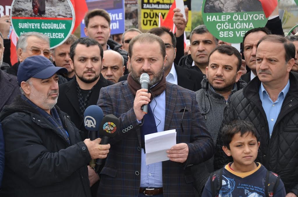 Grup adına basın açıklamasını okuyan Memur-Sen İzmir İl Temsilcisi ve Eğitim-Bir-Sen İzmir 1 No'lu Şube Başkanı Ali Musa Bina, Zulüm, Halepli kardeşlerimizin üzerine bin bir şekliyle gelmektedir. Tüm dünya bu vahşetin suç ortağıdır dedi.