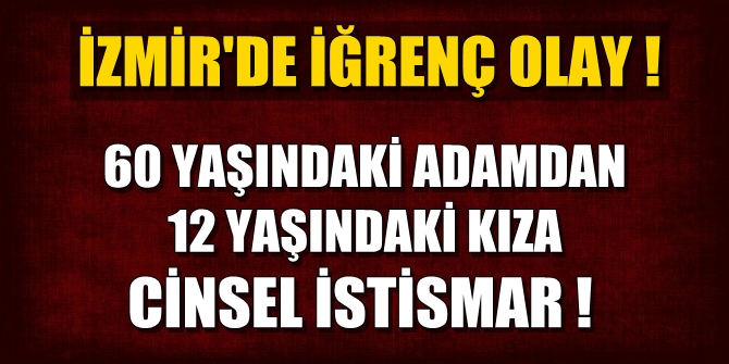 Edinilen bilgiye göre, Torbalı'da oturan kamyon şoförü Y.T. (60) uzaktan akraba oldukları öne sürülen ailenin 12 yaşındaki kız çocuğuna cinsel istismarda bulundu. Y.T., üstelik bir de İddialara göre olanları ailesine söylememesi için de çocuğu ölümle tehdit etti. Küçük kız tehditlere rağmen durumu annesine anlattı. Anne durumu öğrenince hemen karakola giderek şikayetçi oldu. Şüpheli daha sonra İlçe Emniyet Müdürlüğü ekipleri tarafından gözaltına alındı.