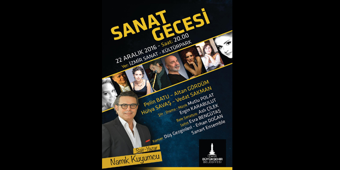 Sanatçı Pelin Batu, teatral olarak kitaptan kadın ve erkek diyologları ile ilgili bölümleri okuyacak. Tiyatrocular Altan Gördüm, Hülya Savaş, canlandırmalarıyla geceye renk katarken, Vedat Sakman aşk şarkılarını İzmirliler için seslendirecek. Baş balerin Aslı Çilek, Carmen’i sergileyecek. Oyuncu Mutlu Polat’a nefesli çalgılarla Ergin Karabulut eşlik edecek. Düş Gezginleri ve Erhan Doğan, Namık Kuyumcu'nun bestelenmiş şiirlerinden şarkılar sunacak. Gecenin son bölümünde ise Sanart Ensemble grubu sahne alacak.