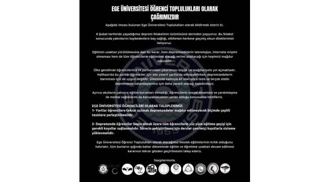 Ege Üniversitesi Öğrenci Toplulukları hazırladıkları ortak açıklamada şunları kaydetti: “Bu karar, hem depremzede öğrencilerin teknolojiye ve internete erişiminin olmaması hem de diğer öğrencilerin eğitimden alacağı verimi azaltacağı için hepimizi mağdur edecektir. Ülke genelinde öğrencilerin KYK yurtlarından çıkarılması büyük bir mağduriyete yol açmaktadır. Ülkemizde kamuya ait onca tesisi, boş konut ve otellerin depremzede vatandaşlarımız için daha yararlı olacağı kanısındayız. Ayrıca okulların yalnızca eğitim kurumları olmadığı, öğrencilerin sosyal dinamizm ve yardımlaşma ile mental sağlıklarını da koruyabilecekleri yerler olduğu konusunda hemfikiriz.”