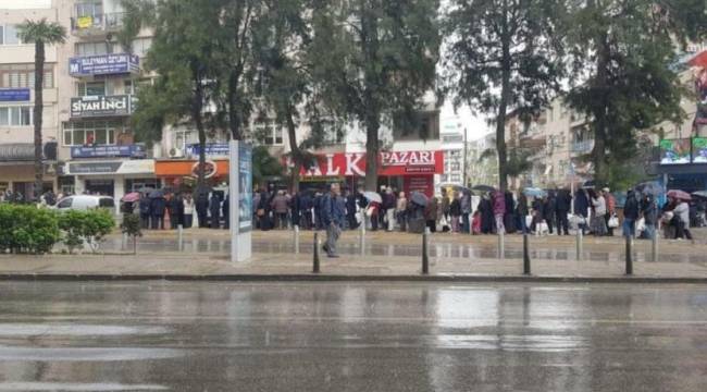 İzmir'in Buca ilçesinde sağanak yağmura rağmen "Askıda Ekmek" bekleyen yurttaşlar uzun kuyruklar oluşturdu.