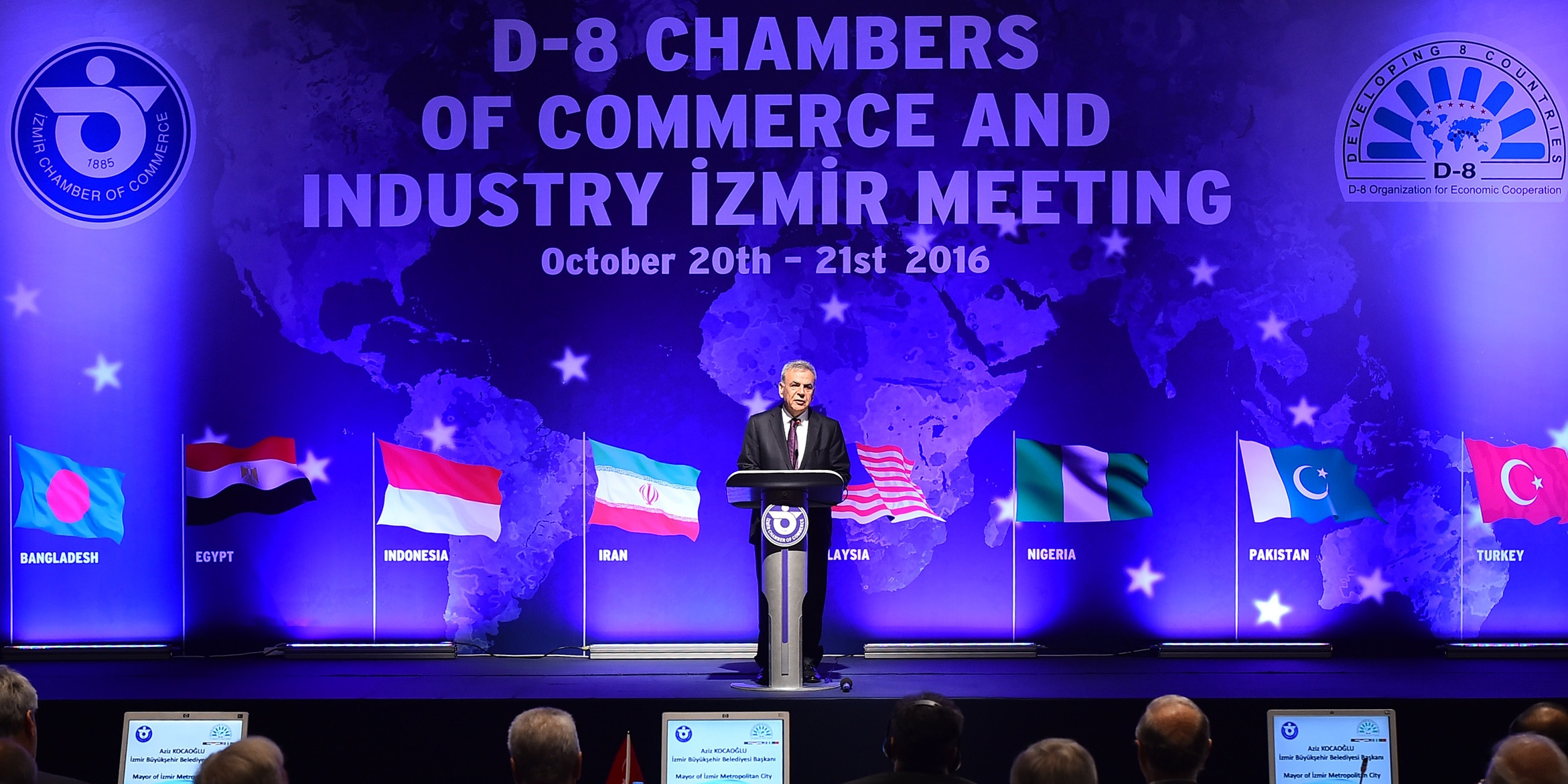 Bangladeş, İran, Nijerya, Türkiye, Mısır, Endonezya, Pakistan ve Malezya'dan 16 ticaret odasının üst düzey 30 yöneticisi, “D-8 Ticaret ve Sanayi Odaları İzmir Toplantısı” nedeniyle İzmir’de buluştu. İzmir Ticaret Odası’nın evsahipliğinde gerçekleştirilen zirvede konuşan İzmir Büyükşehir Belediye Başkanı Aziz Kocaoğlu, tamamı İslam İşbirliği Örgütü üyesi olan bu ülkelere, İslam coğrafyasında yaşanan terör olayları ve sefaletin sona erdirilmesi için çağrıda bulundu. Özellikle Ortadoğuda'da yaşanan sürece dikkat çeken Başkan Aziz Kocaoğlu, “Yüce İslam dininin özüne dönülerek, aklın ve bilimin önderliğinde yeniden barışın ve kardeşliğin tesis edilmesi gerekiyor” diye konuştu.