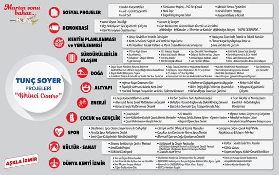Soyer’in ilk aşamada sunduğu 98 proje arasında, ulaşım ve otopark sorunlarını çözmek için kesinleştirilmiş ve bütçesi hazırlanmışmetro ve tramvay yatırımları, bağlantı yolları ve alt geçitgibi çok sayıda yatırım bulunuyor. Öte yandan, sosyal projeler kapsamındaev kadınlarını, emeklileri, gençleri ilgilendiren çok sayıda çalışma Soyer’in vizyonu arasında yer alıyor. Soyer, doğanın korunması ve İzmirlilerin doğayla birlikte yaşaması için de yepyeni çalışmalar açıkladı.