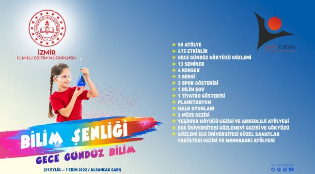 2023 Eğitim Vizyonunun temel amacı olan “Çağın ve geleceğin becerileriyle donanmış, bu donanımı insanlık hayrına sarf edebilen, bilime sevdalı, kültüre meraklı, duyarlı, nitelikli, ahlaklı bireyler yetiştirmek hedefinden yola çıkan İzmir İl Milli Eğitim Müdürlüğü bu kapsamda “Gece Gündüz Bilim” şenliği düzenliyor. Ulaşılması kolay bir alanda gerçekleştirilecek şenlik alanında aile sağlığı, ilkyardım merkezi, mescit, sergi ve toplantı salonları bulunuyor.
