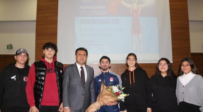 Yentür’ün konuşmalarının ardından Avrupa ve Dünya Şampiyonu Güreşçi Kerem Kamal ve İzmir İl Milli Eğitim Müdürlüğü Spor Koordinatörü, eski Dünya Şampiyonu Milli Güreşçi Ahmet Taçyıldız sahneye davet edildi. Spor yaptığı dönemlerde yaşadıklarından kısaca bahseden Taçyıldız sözü Kerem Kamal’a bıraktı. Yaşadığı tecrübeleri paylaşmak üzere söz alan Kerem Kamal; burada olmaktan duyduğu memnuniyeti dile getirdi ve güreşe başlama hikayesini anlattı. Kamal; “aileme, ülkeme, beni seven herkese bir olimpiyat madalyası borçlu olduğumu düşünüyorum. Spor yapmak çok fedakarlık gerektiriyor. Bazı şeyleri istiyorsak, bazı şeylerden fedakarlık etmemiz gerekiyor çünkü cefa olmadan sefa olmuyor.” dedi. Hayallerinin ötesinde bir hayat yaşadığını ve bunun spor sayesinde olduğunu ifade eden Kamal, sporun mutluluk sağladığına inandığını, kendini mutsuz hissettiği zaman spor yaparak bütün sorunlardan kurtulduğunu düşündüğünü sözlerine ekledi. Kamal; sanat ya da spor, ne ile uğraşılırsa uğraşılsın her işte cesur olunmasının gerektiğini, aynı zamanda istemenin, inanmanın, istikrarlı ve disiplinli olmanın, çalışmanın ve gayret etmenin çok önemli olduğunu vurguladı.