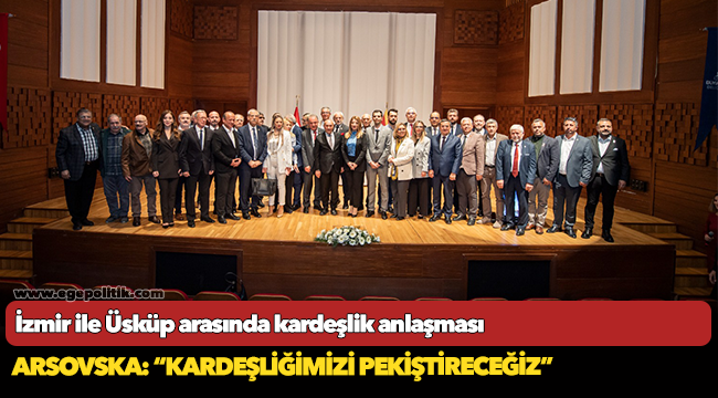 İzmir Büyükşehir Belediyesi, Kuzey Makedonya'nın Üsküp kentiyle “kardeş kent” anlaşması imzaladı. İzmir Büyükşehir Belediye Başkanı Tunç Soyer’in ev sahipliğinde Ahmed Adnan Saygun Sanat Merkezi’nde düzenlenen imza törenine Üsküp Belediye Başkanı Danela Arsovska, Dışişleri Bakanlığı İzmir Temsilcisi Büyükelçi Naciye Gökçen Kaya, Kuzey Makedonya'nın İstanbul Başkonsolosu Aktan Ago, CHP milletvekilleri Kani Beko ile Kamil Okyay Sındır, Konak Belediye Başkanı Abdül Batur, Gaziemir Belediye Başkanı Halil Arda, Ödemiş Belediye Başkanı Mehmet Eriş, CHP İzmir İl Başkanı Şenol Aslanoğlu, İzmir Büyükşehir Belediyesi ve Üsküp Belediyesi meclis üyeleri, Balkan derneklerinin ve siyasi partilerin temsilcileri katıldı.