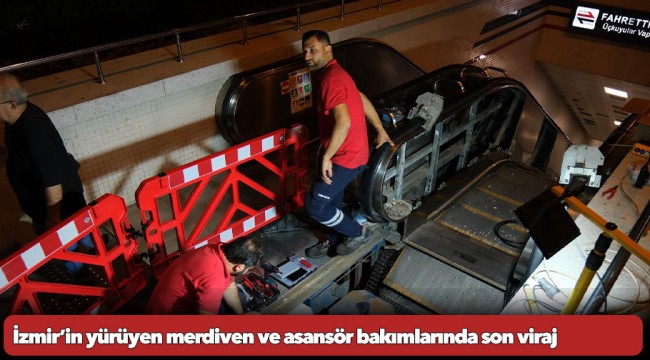 İzmir Büyükşehir Belediye Başkanı Dr. Cemil Tugay’ın talimatıyla başlatılan yürüyen merdiven ve asansör bakım çalışmaları, gece gündüz demeden hızla sürdürülüyor. Yürüyen merdiven ve asansör kazalarının bir daha yaşanmaması için daha önce yapılmamış ölçüde, detaylı bakım ve onarım çalışması başlatan İzmir Büyükşehir Belediyesi, İzmir Metro AŞ bünyesinde yer alan istasyonlarda riskli gördüğü yürüyen merdiven ve asansörleri kullanıma kapatmıştı. Gerekli tespitlerin ardından yedek parça temin sürecini başlatan İzmir Büyükşehir Belediyesi, parça montajı yapılarak kontrolleri tamamlanan merdivenleri yeniden kullanıma açmaya başladı.