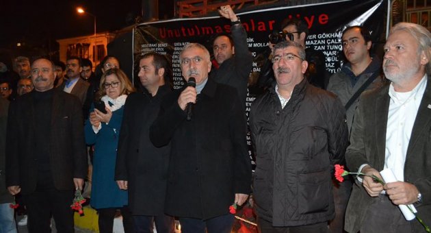 Yapılan basın açıklamasında ülke tarihinin en büyük terör saldırısının üzerinden tam iki ay geçerken, 10 Aralık’ın aynı zamanda İnsan Hakları Evrensel Bildirgesi’nin Birleşmiş Milletler (BM) tarafından kabul edilişinin 67. Yıldönümü olduğu hatırlatıldı. Geçen bu iki aylık sürede ne acılarının ne öfkelerinin dinmediği vurgulanan açıklamada “Öfkemizi, gerçek katiller yargı önüne çıkarılıp adalet sağlanıncaya kadar, barış ve kardeşlik hâkim kılınıncaya kadar haykırmaya devam edeceğiz” ifadeleri kullanıldı. Açıklamada, Rusya ile gerginlik sonrasında açığa çıkan belgelerin Türkiye Cumhuriyeti’nin bir aile şirketi gibi yönetildiği, Ankara ve Paris katliamlarının faili, insanlık düşmanı barbar örgüt İŞİD ile ticaret ortağı olunduğu belirtildi. Basın açıklamasında, “Ülkeyi yönetenler, Ankara katliamı öncesinde gerekli önlemleri almayıp dolaylı sorumlu olmanın ötesine geçmiş, IŞİD ile yaptıkları işbirliği vasıtasıyla katliamın dolaylı faili olmuşlardır. Havuz medyasının, iktidar borazanlarının katliama ilişkin gerçeklerin üzerini örtme çabalarının bundan kaynaklandığı açıktır. Havuz medyasının aksine, IŞİD barbarlığı ile işbirliğine ilişkin habercilik görevini yerine getirenler ise Can Dündar ile Erdem Gül’ün tutuklanmaları örneğinde çok açık bir şekilde görüldüğü üzere iktidarın her türlü tehdit ve baskısına maruz kalmaktadır. İzmir emek, barış ve demokrasi güçleri olarak, baskılar karşısında susmayan onurlu basın emekçilerinin yanında olduğumuzu bir kez daha vurgulamak isteriz” denildi. Açıklamada devamla, “Bizler Ankara Katliamını ve halklarımıza yaşatılan diğer katliamları unutmadık, unutturmayacağız. Önümüzdeki sürecin korku imparatorluğu kurulmasını engellemek için sokakları, meydanları doldurmaya devam edeceğiz. Medya, üniversiteler, sermaye grupları üzerinde oluşturulan baskının farkındayız. İşçiler, emekçiler, mühendisler, doktorlar, yoksullar tüm ezilen halkların mücadelesiyle korku imparatorluğunun kuruluşuna karşı duracağız” ifadelerine yer verildi.