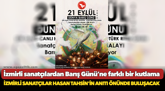21 Eylül Dünya Barış Günü kutlamaları kapsamında İzmirli sanatçılar Kurtuluş Savaşımızın ilk kurşununu sıkan, ilk şehidimiz Hasan Tahsin’in anıtı önünde buluşacak. Türkiye de ilk defa 21 Eylül Dünya Barış Günü farklı kutlanacak. Merkezi İzmir’de olan ve 35 ülkede temsilciliği bulunan Uluslararası Aktivist Sanatçılar Birliği (UASB ) öncülüğünde; Afrotürk Derneği’nin ritm grubu, Sokak Sanatları Atölyesinden canlı heykeller ile Maskizm masklı canlı performanslar, Karşıyaka Kültür ve Sanat Derneği’nden dans gösteri grupları, barış şiirleri okuyacak olan İzmirli şairler, İzmir Müzisyenler Derneği müzisyenleri ve Düş Gezginleri Müzik Yayın Organizasyon Grubu’nun katılımı ile Türkiye de ilk defa 21 Eylül Dünya Barış Günü farklı kutlanacak.