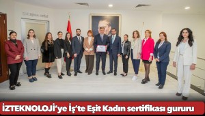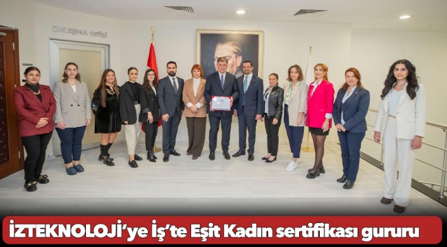 İş hayatında kadınlara eşit haklar ve fırsatlar sunan kurumların sahip olduğu İş’te Eşit Kadın Sertifikası, İzmir Büyükşehir Belediyesi iştiraki İZTEKNOLOJİ’ye verildi. Sürdürülebilirlik Akademisi ve İngiltere merkezli denetim şirketi Intertek iş birliği ile yapılan bağımsız bir denetim sonrası bu yaklaşımlarını belgelendiren kurumlar, İş’te Eşit Kadın Sertifikası almaya hak kazanıyor. İZTEKNOLOJİ ise bu önemli belgeyi almaya hak kazanan Türkiye’deki ilk belediye şirketi oldu. İzmir Büyükşehir Belediye Başkanı Dr. Cemil Tugay; İZTEKNOLOJİ Yönetim Kurulu Başkanı Andaç Pamuk, Genel Müdür Emrecan Durmaz, Genel Müdür Yardımcısı Gülşah Yaman Seyis ve şirketin çalışanları ile bir araya geldi. Başkan Tugay, bu önemli sertifikayı almaya hak kazanan şirketi tebrik etti.