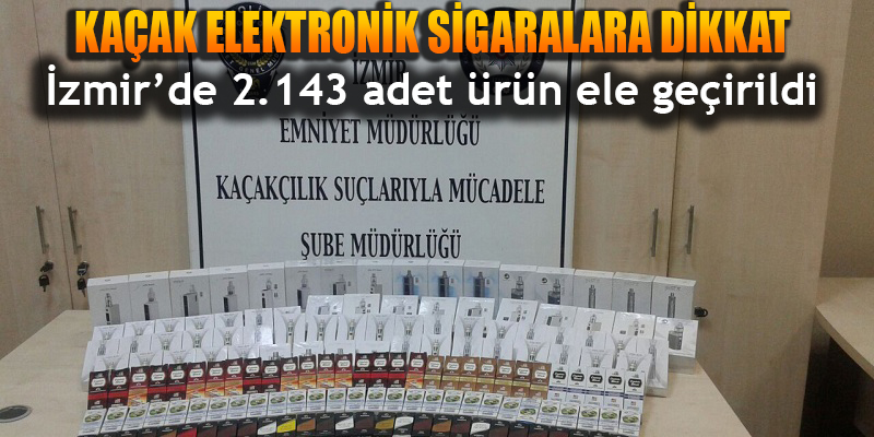 03.02.2017 tarihinde, Kaçakçılık Suçlarıyla Mücadele Şube Müdürlüğü ekipleri tarafından İlimiz Konak ve Bornova ilçelerinde 6 farklı adrese yapılan eş zamanlı operasyon ile 179 adet elektronik sigara, 1233 adet elektronik sigara likiti ve 731 adet elektronik sigara atomizeri olmak üzere toplam 2.143 adet ürün ele geçirilmiştir. Ülkemize girişi yasak olan elektronik sigara ve aparatları temin eden O.İ.(56), Ş.D.(58), T.İ.(65), Ö.Y.(51), F.Ç.(27), M.T.(58) ve M.A.(48) yakalanmışlardır.
