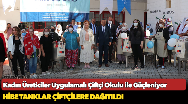 FAO tarafından finanse edilen hibe tanklar, İzmir İl Tarım ve Orman Müdürü Mustafa Özen, FAO Türkiye Temsilci Yardımcısı Ayşegül Selışık, İl Müdür Yardımcıları, İlçe Müdürleri ve Eğlenhoca Mahallesi çiftçilerinin katılımıyla kadın çiftçilere dağıtıldı.