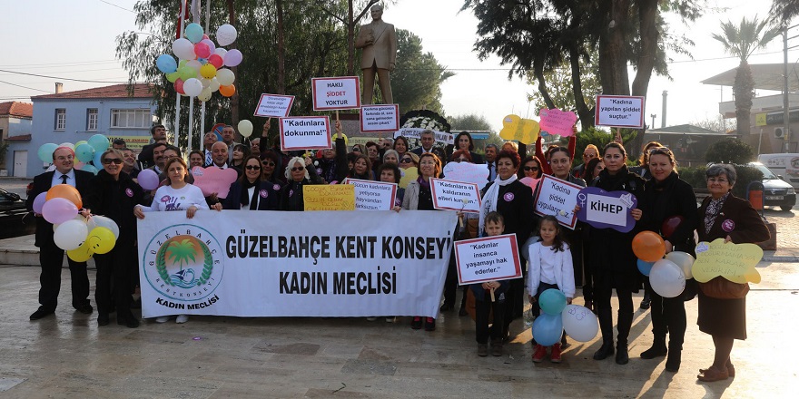 Güzelbahçe Kent Konseyi Kadın Meclisi’nin öncülüğünde bir grup Güzelbahçeli kadın, 25 Kasım Kadına Yönelik Şiddete Karşı Uluslar arası Mücadele Günü kapsamında protesto gösterisi yaptı. Kadınlar, şiddet uygulayan erkekleri Atatürk’e şikayet ettiler, çelenk bıraktılar.