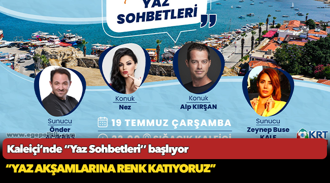 Seferihisar Belediyesi, yaz akşamlarını birbirinden güzel etkinliklerle renklendirmeye hazırlanıyor. Sunuculuğunu Önder Açıkbaş ve Zeynep Buse Kale’nin üstlendiği “Yaz Sohbetleri” önemli konular ve konukları ile yaz akşamlarının vazgeçilmezi olacak. 19 Temmuz Çarşamba akşamı saat 22.00’da Sığacık Kaleiçi’nde yapılacak ilk buluşmanın konukları ise sinema oyuncusu ve sunucu Alp Kırşan ile pop müziği sanatçısı Nez olacak. 2 ay boyunca her Çarşamba devam edecek “Kaleiçi Yaz Sohbetleri”, KRT TV’den de canlı yayınlanacak.