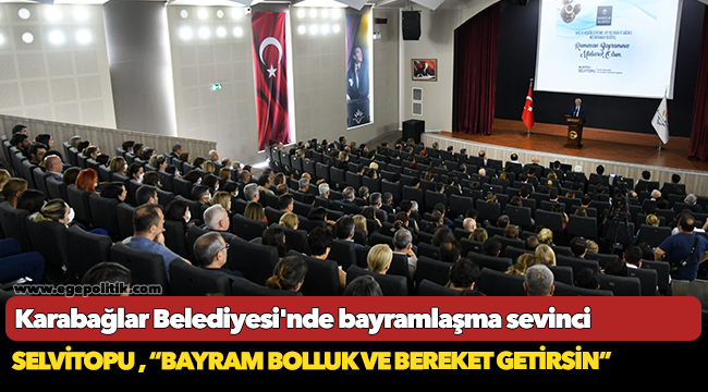 Karabağlar Belediye Başkanı Muhittin Selvitopu, meclis üyeleri, başkan yardımcıları, birim amirleri ve belediye personeli, ana hizmet binasındaki Muzaffer İzgü Konferans Salonu'nda bir araya gelerek bayram sevinci paylaştı. Ramazan Bayramı'nın ülkemize bolluk ve bereket getirmesini dileyen Başkan Selvitopu, “Karabağlar Belediyesi istikrarlı yapısını korumaya ve 500 bin insanımıza daha nitelikli hizmet vermek için çalışmaya devam edecektir” dedi.