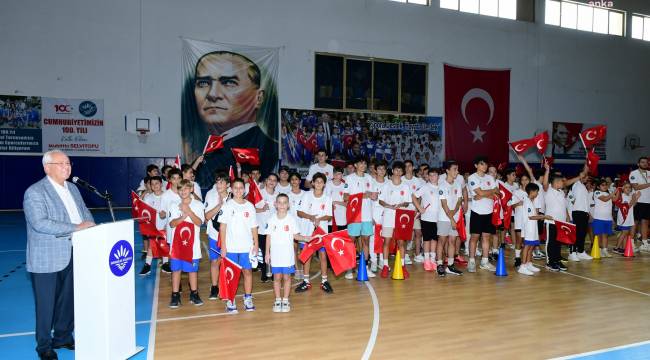 Karabağlar Belediyesi'nin Cumhuriyet'in 100. yılı nedeniyle düzenlediği basketbol turnuvası, İhsan Alyanak Spor Salonu'nda büyük bir coşkuyla gerçekleştirildi. 250'ye yakın Karabağlar Belediyesi Basketbol Spor Okulu öğrencisinin katıldığı turnuvada, her sporcuya 100. yıl tişörtü, basketbol topu, madalya ve Türk bayrağı armağan edildi.